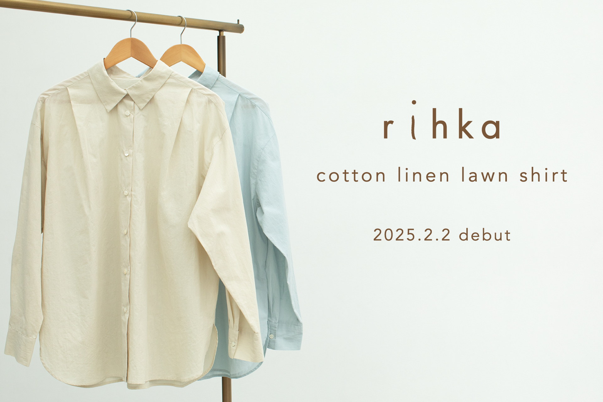 いつもrihkaをご利用いただきありがとうございます。 この度、アパレルラインの新作として、ネイルポリッシュの色味からインスパイアされたシャツを、2025年2月2日(日)11:00より公式オンラインストアで販売することとなりました。 なお、本アイテムは1月21日(水)より開催するジェイアール名古屋タカシマヤと、1月29日(水)より開催する札幌三越でのポップアップストアにて、先行発売します。 cotton linen lawn shirt / 2色 / ¥19,800(税込) ナチュラルな生地感とさりげない透け感が特徴のコットンとリネンを混ぜたローン生地を採用。薄手で軽やかな素材感が魅力で、さっと羽織るだけで抜け感のある美しいシルエットが完成します。さらに、ワッシャー加工を施すことで、柔らかさと程よい表情をプラス。日々のスタイリングに取り入れやすい、リラックスした着心地のシアーシャツが誕生しました。 オンラインストア販売日時:2025年2月2日(日)11:00 販売サイト:https://rihka.com サイズ:one size sage(セージ) / RAP057 ネイルポリッシュ「sage」からインスパイアされた、心が浄化されるようなやさしさを感じる落ち着いた印象のイエローグリーン。 écume(エキュム) / RAP058 ネイルポリッシュ「écume」からインスパイアされた、きらめく海を連想させるフレッシュな印象のシアーブルー。
