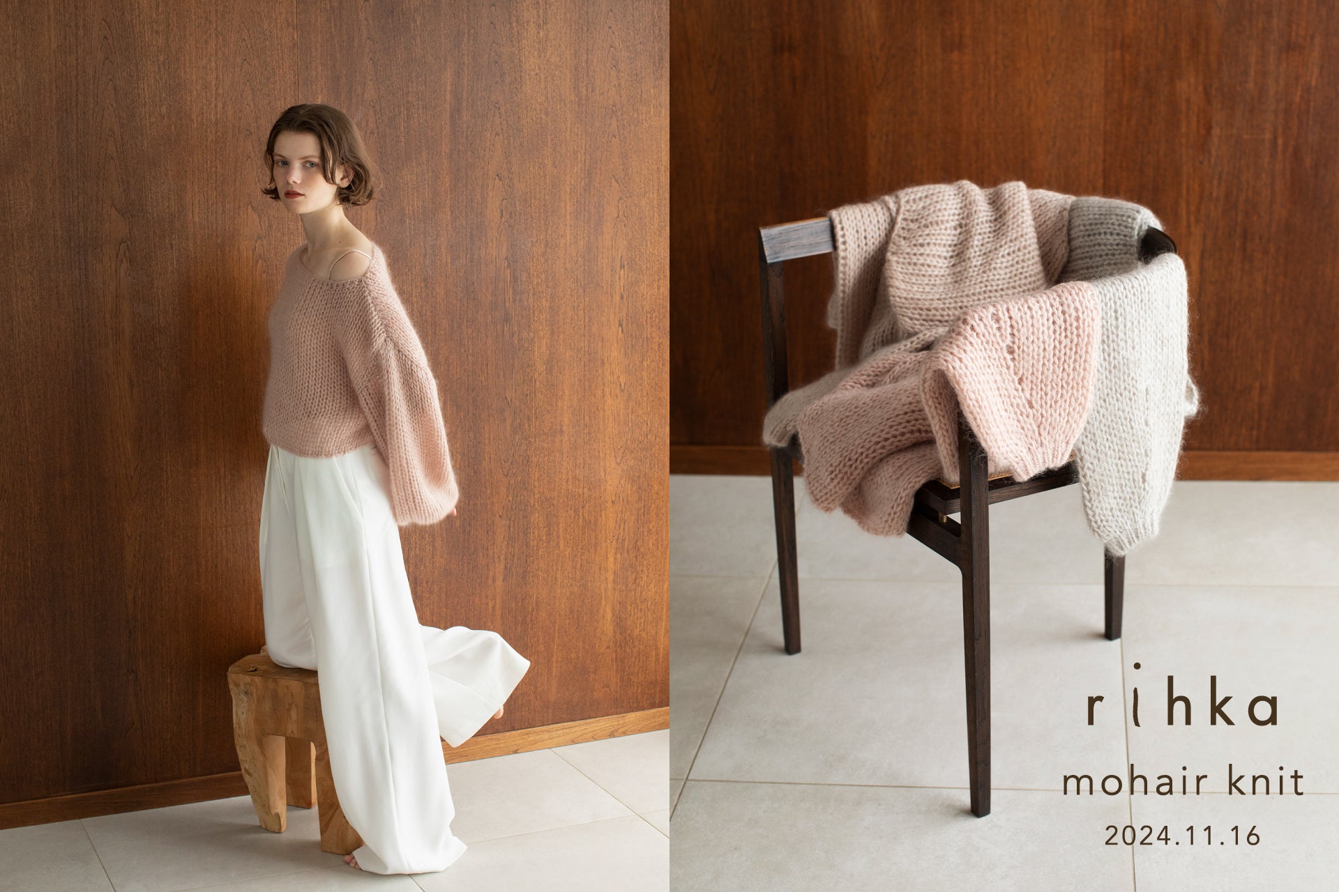 いつもrihkaをご利用いただきありがとうございます。 この度rihkaから、ネイルポリッシュの色味からインスパイアされた新作の「mohair knit」3色を、2024年11月16日(土)11:00より公式オンラインストアで数量限定にて発売します。 rihka mohair knit / one size / ¥33,000(税込) 昨年好評だったmohair knitが、シルエットとカラーをアップデートした新デザインで登場します。なめらかで柔らかい肌あたりのキッドモヘヤをざっくり編んだ、ウォーム感ととろけるような風合いが特徴のニット。袖のボリューム感はそのままに、様々な着こなしを楽しめるようコンパクトな丈感にしつつ、デコルテをより美しく見せるネックデザインに仕上げています。肌をきれいに魅せてくれるrihkaオリジナルのニュアンスカラーです。なお、本商品は11月13日(水)から開催する伊勢丹新宿店のポップアップストアにて、数量限定で先行発売します。 ・オンラインストア発売日:2024年11月16日(土)11:00・公式オンラインストア:https://rihka.com・伊勢丹新宿店先行発売日:2024年11月13日(水) *詳細は、商品ページをご確認ください calm カルム(RAP054) ネイルポリッシュ「calm」からインスパイアされた、顔まわりを明るく見せてくれる、温かみのあるサーモンピンク。 hug ハグ(RAP055) ネイルポリッシュ「hug」からインスパイアされた、どんなスタイリングにも合わせやすい、くすみピンクベージュ。 mère メール(RAP056) ネイルポリッシュ「mère」からインスパイアされた、深みの中に優しさを感じるウォームグレー。 ▶コレクションページはこちら