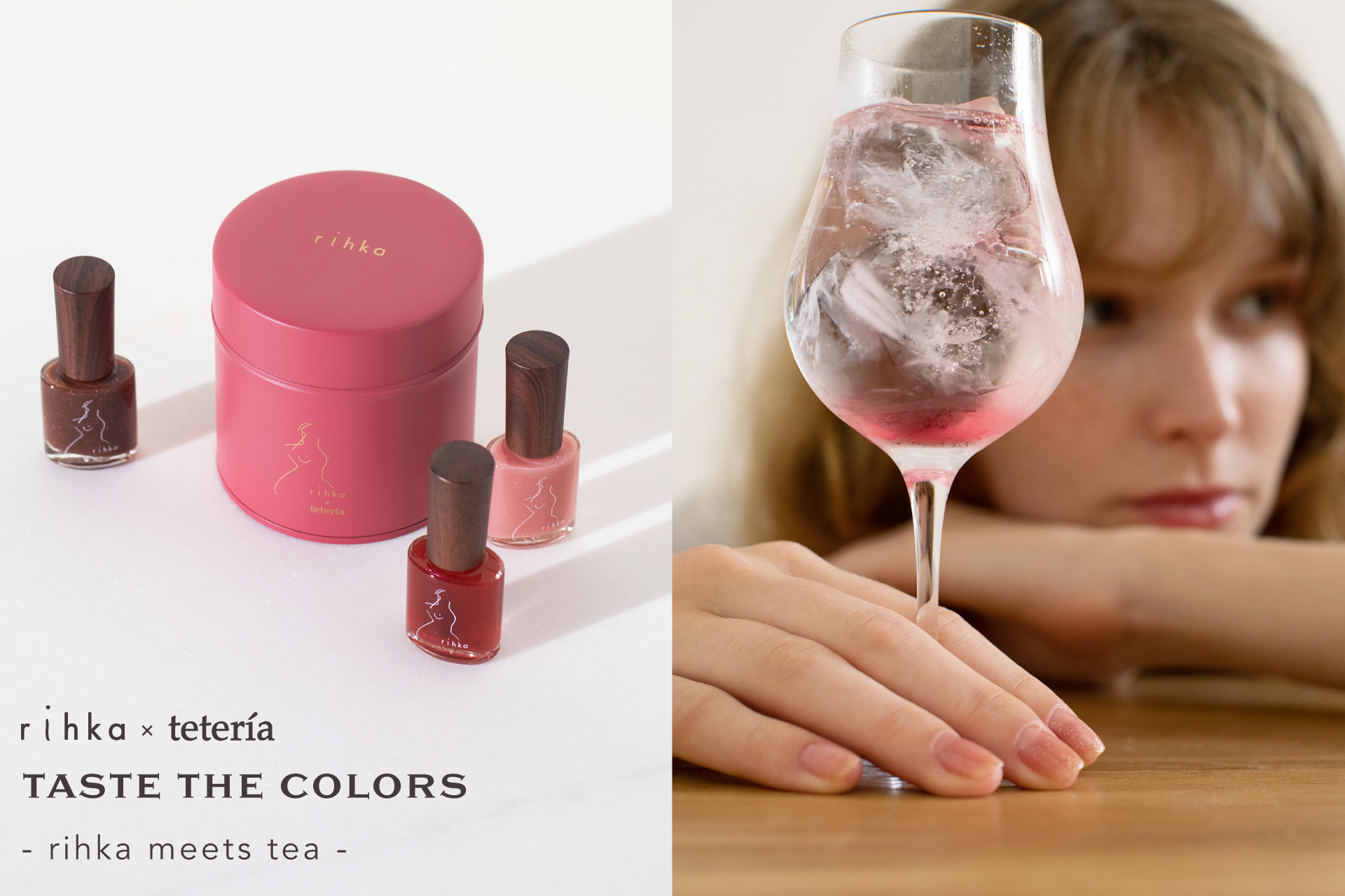 いつもrihkaをご利用いただきありがとうございます。 この度rihkaから、大西 進氏の紅茶ブランド「teteria(テテリア)」とコラボレーションした限定ネイルポリッシュコレクションを、2024年7月28日(日)11:00より公式オンラインストアで販売します。また、本コラボレーションを記念したスペシャルイベントを、7月26日(金)から7月28日(日)まで、東京都渋谷区の「FOOD FOR THOUGHT LAB」にて開催します。 collection concept taste the colors - rihka meets tea - 朝の光を浴びながら、力強さを感じる深く澄んだ赤色のアッサムティーで一日をスタート。 午後にはミントとラベンダーが軽く香る、爽やかなライトブラウンのアイスティーで身体と心をクールダウンしてリフレッシュ。 夕日を感じながら透き通ったピンク色のシュワっとしたティーソーダを。 澄んだ綺麗な色とローズのやさしい香りはリラックスタイムの始まりに。 グラスの中でふんわりと広がる美しいお茶の色から生まれた、限定ネイルポリッシュコレクション。 teteria 大西氏より 毎日のティータイムを大切にしている未来さんが、グラスの中ではじけるティーソーダや紅茶をネイルにしてくれました。私たちをリラックスさせたり、心地良くしてくれたりする紅茶の色を指先まで連れ出してくれたのです。 色はいつも、ふとした瞬間に私たちを助けてくれる。その色に強さや優しさ、今の自分をポジティブに後押ししてくれる小さな力が込められているのを知っているから。rihkaのネイルはそうやって私たちを光の中に連れ出してくれるのでしょうね。指先に紅茶を。 teteria 大西 rihka director’s message teteria大西さんの紅茶は美しく、美味しく、そしてなにより自由。 夏の朝に温かいものを飲んでも良いし、apéroの時にアルコールじゃなくてtea sodaを飲んでも良い、爽やかなmintと甘いmilkを組み合わせても良いし、大切な人を癒すのに言葉の前に優しい甘さのmilk teaを淹れてあげるのも良い。 美味しい淹れ方の基本はあるけれど、決まりごとはなくて、人生が豊かになるように、毎日の時間にtea timeが少しあると良いのだと思う。 それはrihkaのアイテムにも同じ気持ちを込めていて、使い方に間違いなんてなくて、色んな組み合わせを楽しんでみたり、引き算したり足し算したり、自由に楽しむ権利が私たちにはあるのだと思っています。 私の大好きな、目から美味しく、美しいteteria の紅茶をネイルにさせて頂くことができてとてもとても嬉しいです。 皆さまに楽しんで頂けますように。 Mirai.M taste the colors - rihka meets tea - ・オンラインストア販売日時:2024年7月28日(日)11:00・スペシャルイベント先行販売日:2024年7月26日(金)・販売サイト:https://rihka.com 【nail polish:数量限定3色 / 9ml / ¥2,970(税込)】 紅茶ブランド「teteria」とコラボレーションした限定ネイルポリッシュ。グラスの中でふんわりと広がる美しいお茶の色を表現した、グラデーションデザインの化粧箱付き。 PINK ROSE ピンクローズ(RNP095) リラックスタイムにぴったりな、透き通ったピンク色のシュワッとはじけるティーソーダ。まるで泡のように煌めく繊細なシルバーグリッター入りの、ローズの香りを連想するやさしいピンクカラー。 MINT BLEND TEA ミントブレンドティー(RNP096) ミントとラベンダーが軽く香る、ハーブと紅茶の爽やかなアイスティー。涼しげな印象の小粒のゴールドグリッター入りのシアーライトブラウン。 ASSAM ORTHODOX アッサムオーソドックス(RNP097) 深く澄んだ赤色が印象的なアッサムティー。光が差し込んだカップの中の紅茶のようにきらめくクリアレッド。 【taste the colors tea:数量限定 / ¥3,630(税込)】 限定デザインのオリジナル紅茶缶とASSAM ORTHODOX、PINK ROSE、MINT BLEND TEAの3種類のお茶をお楽しみいただける合計6個のティーバッグ入りのセット。紅茶缶はrihkaのコスメ収納としてもご使用いただけます。 PINK ROSE ハーブティー。ふわりと持ち上がるバラとラベンダーの香り、ハイビスカスの酸味。透き通ったピンク色。ハチミツでほんのり甘みをつけると花の香りがより楽しめます。 MINT BLEND TEA軽めの紅茶とミント&ラベンダー。すっきりと爽やかなハーブと紅茶の楽しみを。時々ティーソーダでお楽しみください。 ASSAM ORTHODOXインドアッサム地方の紅茶、大きな茶葉。アッサムのオーソドックススタイルのフルリーフはteteriaが最も大事にしている紅茶の一つです。コクのある香味はぜひストレートで、または少しのミルクを加えてあっさりとしたミルクティーを。 【taste the colors nail polish set / ¥8,910(税込)】 taste the colorsコレクションの限定ネイルポリッシュ3色セット。 【taste the colors nail polish & tea set / ¥11,000(税込)】 taste the colorsコレクションの限定ネイルポリッシュ3色とオリジナル紅茶缶の4点セット。紅茶缶の中にはPINK ROSE、MINT BLEND TEA、ASSAM ORTHODOXの3種類のティーバッグが合計6個入っています。また、紅茶缶はrihkaのコスメ収納としてもご使用いただけます。 special eventのご案内 グラスの中でふんわりと広がる美しいお茶の色から