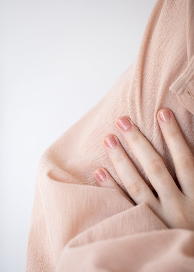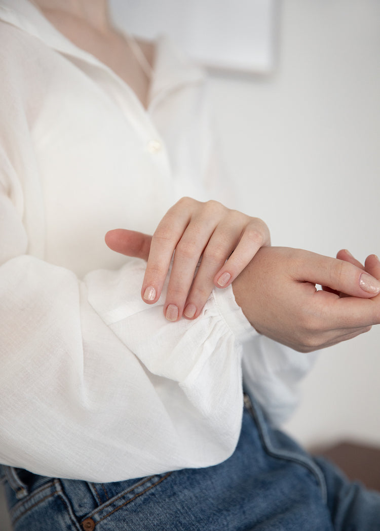フロントボタンを少し開けて鎖骨を美しく見せたり、