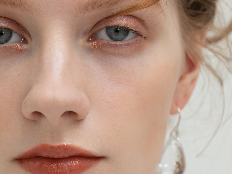 芯のあるしなやかな女性像を表現した軽やかなビターブラウンのsheer T shirt freckleに合わせた、優しく引き締まったブラウンメイクLOOK
