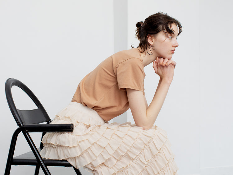 すっきりとした襟ぐりのデザインで、コンパクトな丈感が特徴のTシャツ。