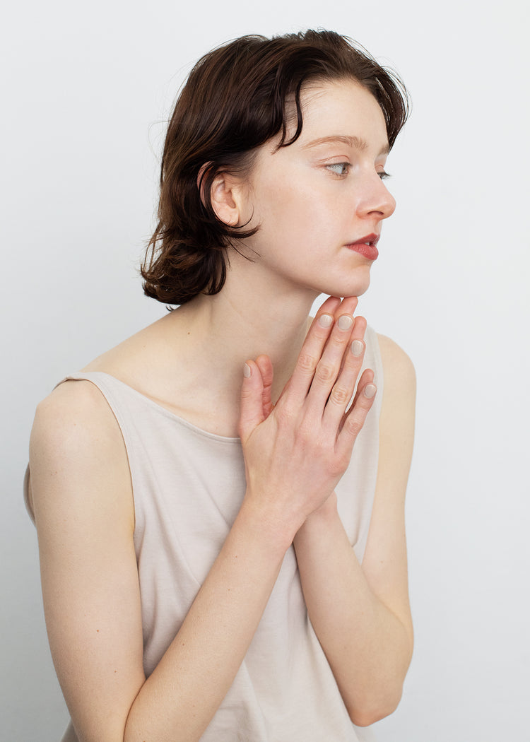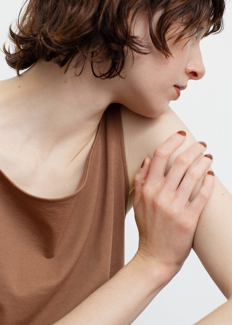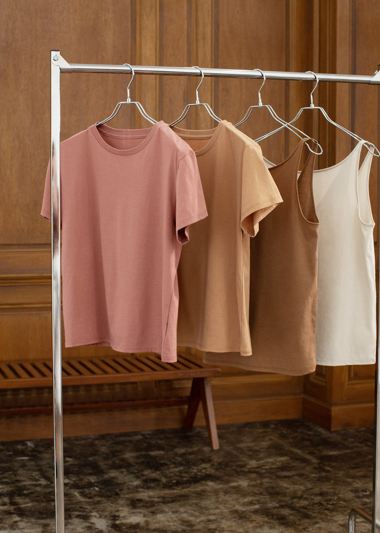 ヘルシーな肌見せができるデザインに。1枚でさらりと着こなせることはもちろん、シャツやジャケットなどを羽織ってももたつかず上品に見える、オールシーズン活躍できるベーシックトップス。