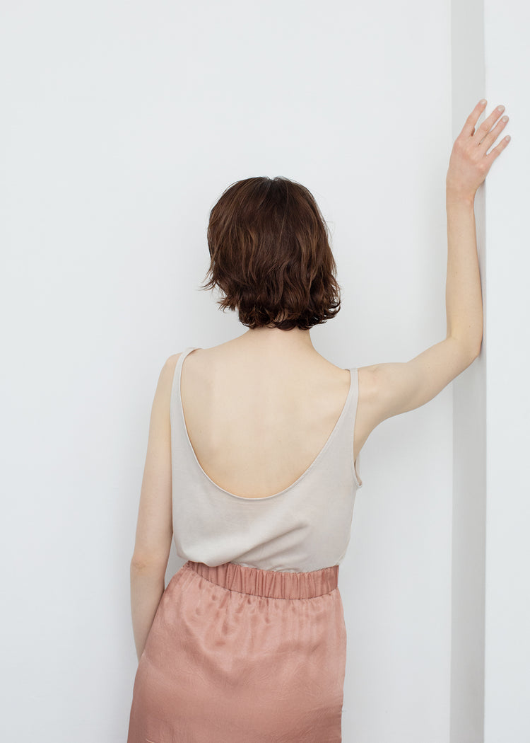 シンプルなボートネックで首まわりをすっきり見せつつ、背中の開きを深めにすることで