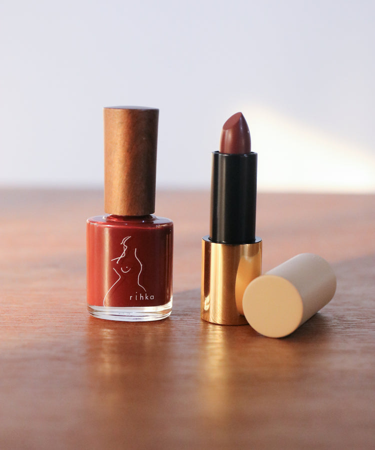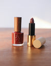シアーなレッドのネイルポリッシュとリップバームの2点セット。