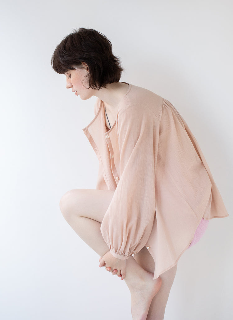 ガーゼ風の生地にシボ加工を施し、ふんわりと軽やかな着心地に仕上げたシアーブラウス。