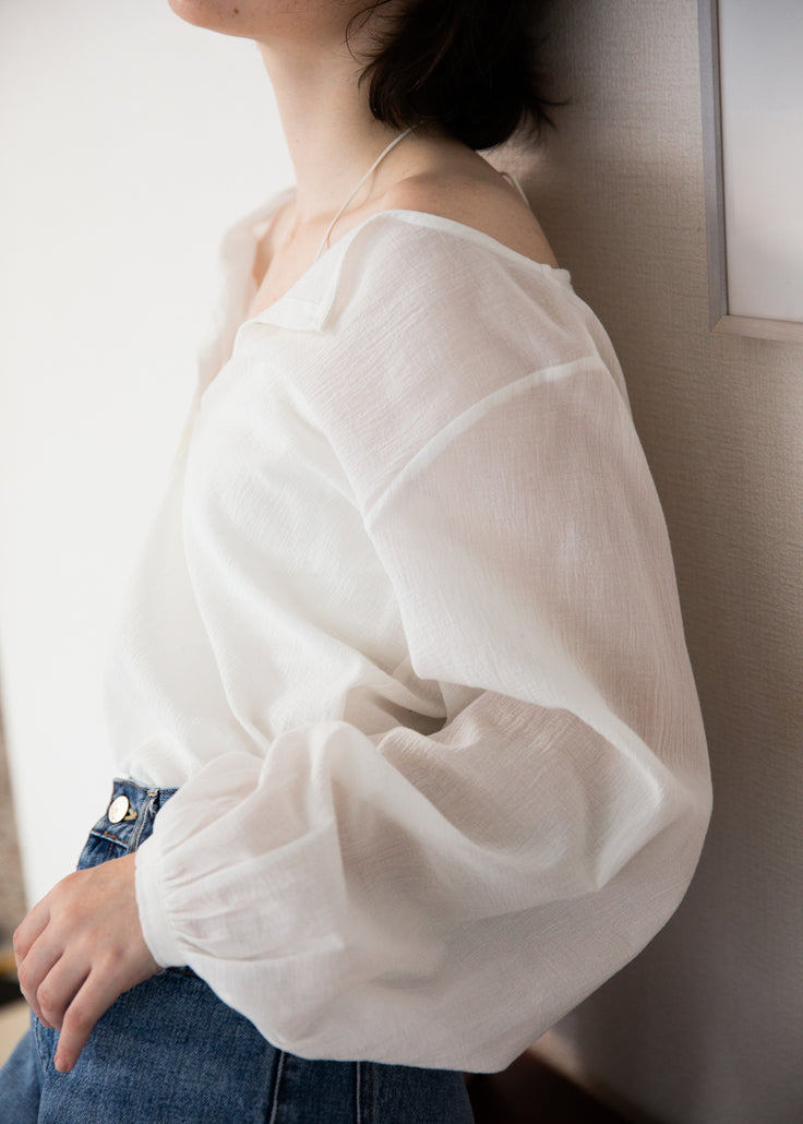 ガーゼ風の生地にシボ加工を施し、ふんわりと軽やかな着心地に仕上げたシアーブラウス。