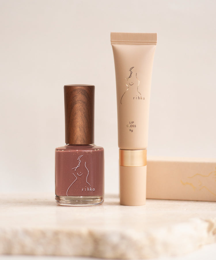 まろやかで深みのあるレッドブラウンのリップグロスとネイルポリッシュを組み合わせた2点セット。